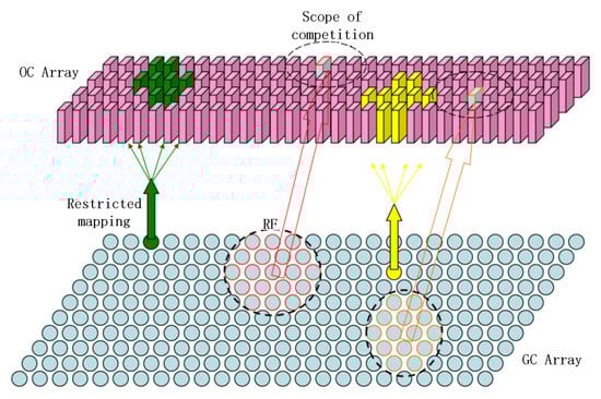 Unlike traditional self-competitive networks, our self-competitive model is not fully connected to the lower layer inputs but instead has limited connections. The upper layer neurons compete and learn from the output of lower layer GCs within the same receptive field in terms of orientation columns as shown in