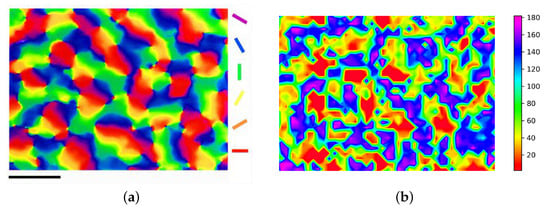 Figure 4a shows the map of cortical functional features. The cortical pinwheel is a unique phenomenon in the cortical orientation map in which singularities, i.e., orderly and uniform increases in orientation selectivity, are produced, which is more likely to occur at the adjacent boundaries of multiple orientation columns. The appearance of cortical pinwheels verifies the validity of the model developed. Training by our theoretical model leads to the results shown in