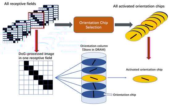 Figure 1. The receptive field layer simulates the oculomotor scanning process of the human eye and simulates some cells in the retina to segment the image in the receptive field into separate receptive fields; the retinal and LGN layers carry out the difference-of-Gaussians (DOG) processing of pixels in the receptive fields as a GC model, and the primary visual cortex carries out the orientation processing of the results of the upper layer processing as an orientation column model to present the representational information and form a cortical orientation map as the output.