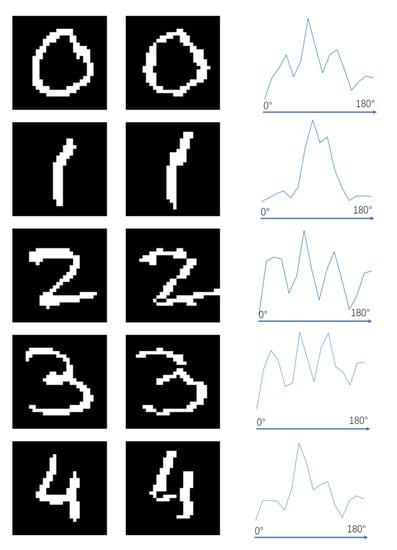 Figure 5a is formed by object rotated by a certain angle, and its representation results are also rotated by a certain angle, which can be seen to have rotation invariance. However, the representation results are very different among different objects and present different distributions on the orientation feature space as shown in