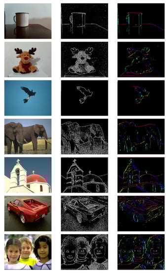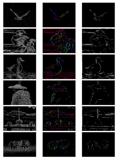 Figure 15, the array captures the variations in brightness and darkness in the edge regions, making the edges of the image more pronounced. However, the extracted results are coarse and accompanied by a significant amount of salt-and-pepper noise. The third column represents the results of the orientation chips array’s representation of the image. The entire image is composed of multiple oriented chips resembling line segments, with different colored lines representing patches with different optimal orientations. Compared to the processing results of the GCs array, the OCs array significantly reduces noise and eliminates numerous invalid edges, resulting in a clearer representation. From this representation result, we can obtain both a feature descriptor to describe the entire image and the distribution of features with the same orientation within the image.