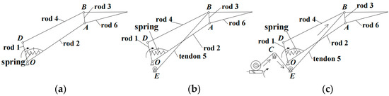 As shown in Figure 2b, the c1-2-3-5 and 1-2-3-4 mechanisms work in this mode. This mode needs tendon 5 to remain in a tension state; then, tendon BE will be equivalent to a rigid linkage. The proximal phalanx and distal phalanx will move with a fixed coupling ratio before contacting objects. When the proximal phalanx contacts objects and stops moving, the tendon driving motor starts to rotate, causing tendon 5 to extend and release a degree of freedom, allowing the distal phalanx to continue moving until enveloping the object.