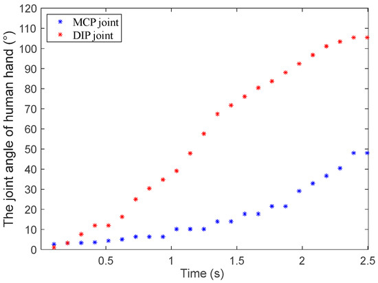 To verify the proposed multi-mode finger’s grasping performance, the finger’s shape-adaptive, coupled-adaptive, and variable coupling-adaptive grasping modes are tested and analyzed in this paper. We collect the finger’s MCP and distal interphalangeal (DIP) joints’ angle data using two bending sensors. Then, we compare and analyze the movement characteristics between the human hand and mechanical finger, as shown in Figure 11, Figure 12 and Figure 13.