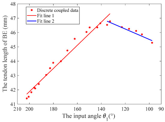 Figure 7. The length change rule of tendon BE in variable coupling-adaptive grasping mode (grasping a flat saucer, for example, as shown in Figure 5).
