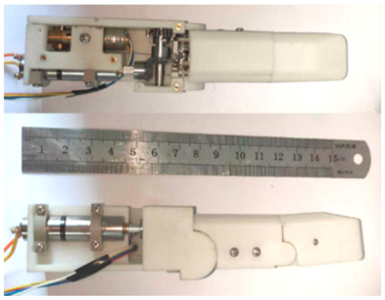 The three-dimensional internal structure of the finger proposed in this paper is shown in Figure 8. The linkage driving motor and the tendon driving motor are placed parallel and opposite to make the structure more compact. The tendon is arranged at the symmetrical center of the finger. The proximal phalanx adopts two sets of linkage mechanisms with the center symmetrical to distribute the load evenly, reduce the risk of jamming, and increase the strength of the mechanism. A worm gear mechanism is connected at the output shaft of the tendon driving motor, which has a self-locking function to ensure the tendon cannot be stretched in the coupled-adaptive mode.