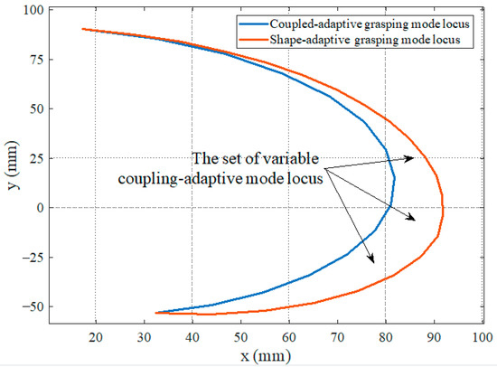 Based on the above grasping experiments, the finger presented in this paper can achieve the three grasping modes. The fingertip locus of the finger in the shape-adaptive and coupled-adaptive modes is drawn through kinematics, as shown in Figure 14. It can be seen that the grasping space of the shape-adaptive grasping mode is the largest, and the coupled-adaptive grasping mode is the smallest. In addition, the grasping space of the variable coupling-adaptive grasping mode is in the middle part between them. By controlling different speed change rules of the tendon driving motor, various variable coupling-adaptive grasping modes can be realized. The finger’s grasping space and motion trajectory can be dynamically adjusted to adapt to different grasping scenes and targets, which improves the finger’s dexterity and grasping mode diversity. The grasping evaluation experiments show that the prototype finger performed well in its shape-adaptive capability and can effectively envelop various cylinders, spheres, rectangular objects, flat plates, and small parts of different diameters, as shown in Figure 15.