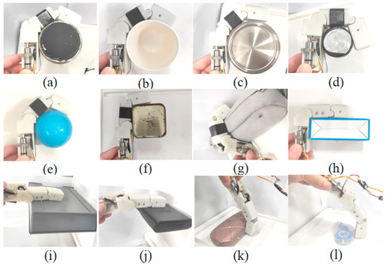 Figure 15. Grasping evaluation experiments. (ag) Grasping tasks carried in the coupled-adaptive mode. (hj) Grasping tasks carried in the shape-adaptive mode. (k,l) Grasping tasks carried in the variable coupling-adaptive mode.