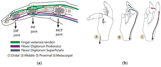 Bioinspired artificial tendons. (a) In green, the extensor tendon (extensor tendons) and the flexion tendons in purple and blue (digitorum profundus and digitorum superficialis, respectively). The contraction of these tendons induces angular movement of the phalanges around the DIP (distal phalanx joint), PIP (proximal phalanx joint), and MCP (metacarpal phalanx joint) articulation points. (b) Independent motions of the finger performed by each artificial tendon. (A) Angular movement around MCP joint; (B) finger flexion; (C) finger extension. (c) The index finger tendon scheme shows the distribution of the artificial extensor/flexor tendons, their fixations, and connections. This pattern is also used on the other fingers.