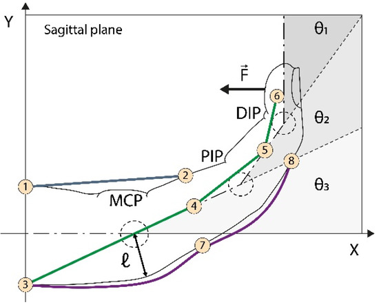 Figure 3 shows eight anchor points used to guide cable motion. Points refer to the palmar artificial tendon (PAT), to to the lateral artificial tendon (LAT), and to the extensor artificial tendon (EAT). For simplification, is used to represent two anchor points, one belonging to the EAT and the other to the LAT. The reference position is defined for at this position, linking the hand longitudinal symmetry line with the -axis. The lengths are computed between the reference position and the displacement position as a function of .