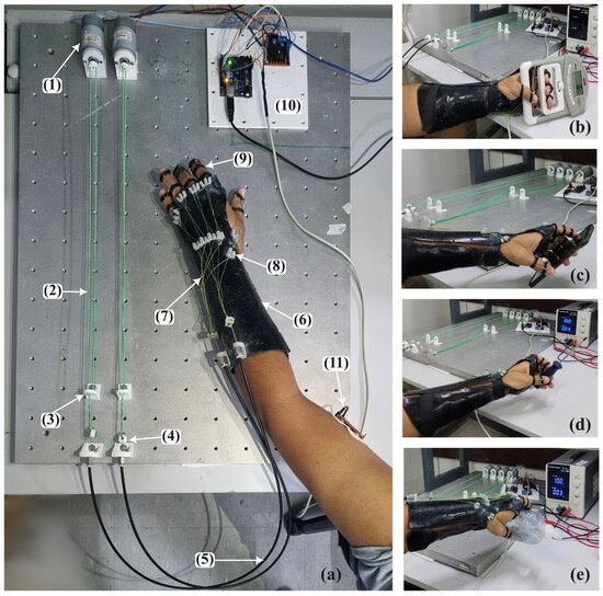 The physical prototype and experimental evaluation. (a) (1) DC motors. (2) Twisted string actuator cables. (3) Screen to prevent the actuator cable from tangling. (4) Actuator–conduit cable connection. (5) Bowden cables. (6) Thermoplastic orthosis. (7) Artificial tendons. (8) Addressing screen for artificial tendons. (9) Finger rings. (10) Electronics composed by Arduino Uno, and H-bridge circuit to drive the motors; (11) myoelectric sensor. (b) Grip strength test. (c) Handling a cell phone. (d) Handling a screwdriver. (e) Handling a bottle of alcohol gel.