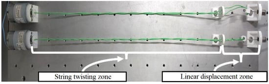 Two TSA are used to drive the exoskeleton. This type of actuation consists of winding two cables to each other to reduce their length, called the string twisting zone in Figure 6, performing a linear movement (linear displacement zone). This approach presents some advantages related to other actuators, such as compliant linear displacement; other types of reducers, which are usually heavy and bulky, are not required; high linear force output with low friction losses results in compact and high-power density actuators [25,30,31,32].