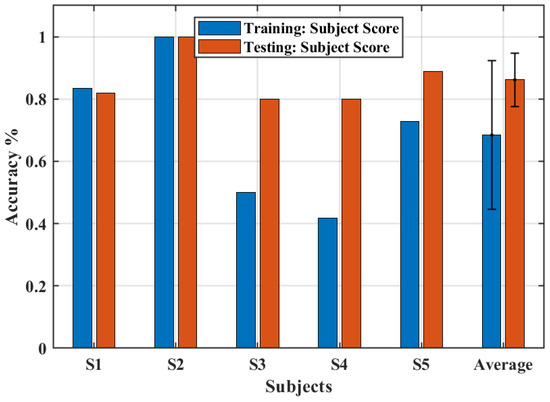 Figure 9 presents the accuracy of the system in determining the intention of the user to perform the movements of closing and opening the hand for the training section and the testing section. Whereas the average accuracy of the training section was 68.4%, the testing sections presented an average accuracy of 86.1%, which is remarkable. All subjects, except S1, had a greater accuracy after the training section. These results highlight the importance of a training section to increase the accuracy of an EMG-based trigger system [29]. Moreover, an excellent accuracy to trigger the system was obtained with a simple setup using just one myoelectric sensor.