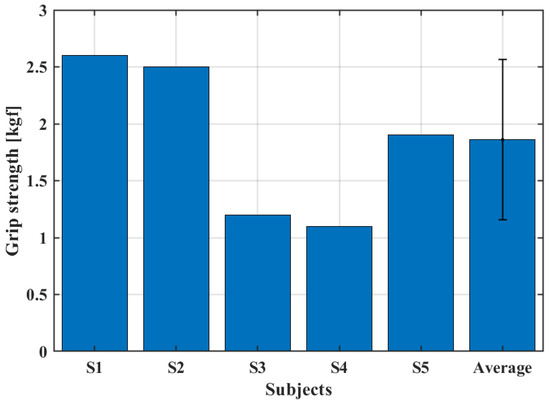 Figure 11 shows the maximum gripping force that the system could perform for each subject. In this condition, an average force of 1.86 kgf was found, which represents about 10% of the grip strength of a healthy subject [35].