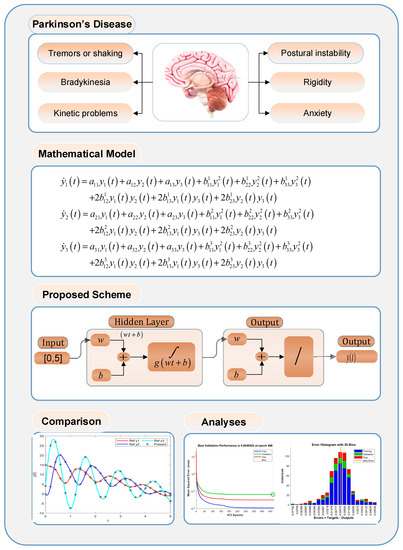 Parkinson’s disease illness (PDI) is a neurological disorder normally caused by an early significant death of dopaminergic neurons, and the resulting deficiency of dopamine within the basal ganglia results in movement disorders [1]. PDI patients may suffer from tremors/shaking, kinetic problems, postural instability, and rigidity and anxiety, as highlighted in Part 1 of the graphical abstract provided in Figure 1. In 2016, around 6.1 million people were affected by the PDI [2], and a rapid increase in PDI patients has been observed in the past two decades [3,4]. The current therapeutic treatments for PDI are based on restoring dopamine levels. These remedies are helpful in providing symptomatic relief to PDI patients, but they are not disease modifying, and, therefore, PDI has remained incurable [5]. Mathematical modeling of PDI may help in better understanding the dynamics of the disease and, thus, improved treatments for its recovery. Different mathematical models of PDI have been proposed [6]. For instance, in [7], Anninou et al. developed a mathematical model for PDI by exploiting the concept of fuzzy cognitive maps, and a generic algorithm was proposed based on nonlinear Hebbian learning techniques. Recently, a wide use of artificial intelligence methodologies for modeling different diseases has emerged [8,9,10], but, as per our exhaustive search, these methodologies are not yet exploited to study the dynamics of PDI. Thus, it seems promising to exploit the well-established strength of machine learning and artificial intelligence techniques to study the dynamics of PDI.
