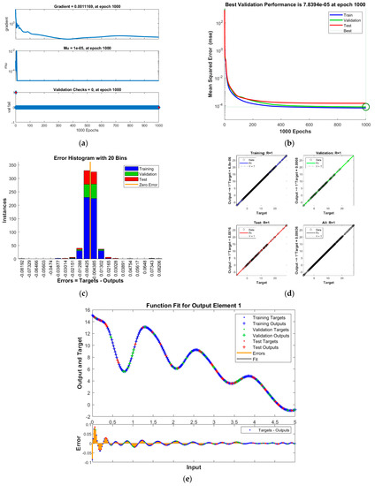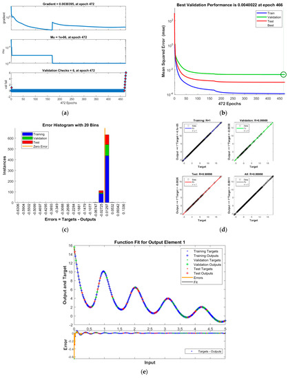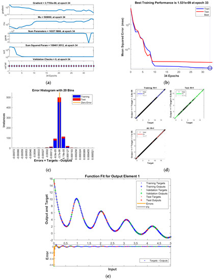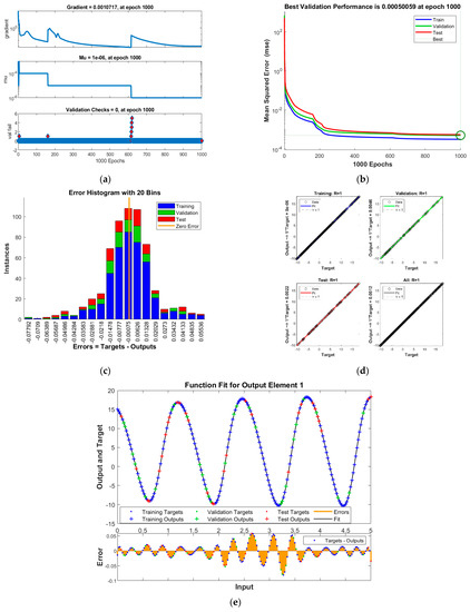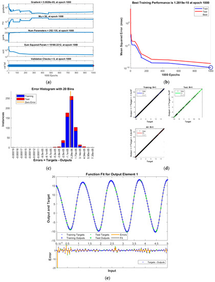 The results of INSNs with BR (INSN-BR) are given in Figure 2, Figure 3, Figure 4 and Figure 5, and the results of INSNs with LM (INSN-LM) are provided in Figure 6, Figure 7, Figure 8 and Figure 9. The results of INSN-LM are provided in Figure 2, Figure 3 and Figure 4 for PDI models 1, 2, and 3, respectively. Figure 2a, Figure 3a, and Figure 4a provide the state transition values; Figure 2b, Figure 3b, and Figure 4b provide the learning curves; Figure 2c, Figure 3c, and Figure 4c present the histogram analyses; Figure 2d, Figure 3d, and Figure 4d provide the regression results; and Figure 2e, Figure 3e, and Figure 4e present the fitting results.