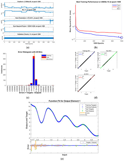 The results of the proposed INSN-LM are provided in Figure 6, Figure 7 and Figure 8 for PDI models 1, 2, and 3, respectively. Figure 6a, Figure 7a, and Figure 8a provide the state transition values; Figure 6b, Figure 7b, and Figure 8b provide the learning curves; Figure 6c, Figure 7c, and Figure 8c present the histogram analyses; Figure 6d, Figure 7d, and Figure 8d provide the regression results; and Figure 6e, Figure 7e, and Figure 8e present the fitting plots.