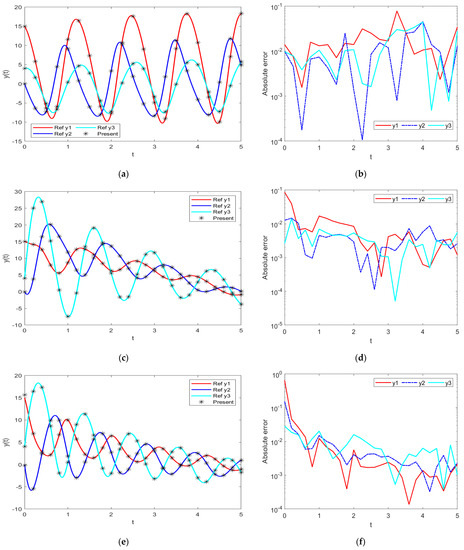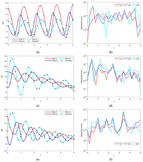In order to further demonstrate the accuracy/correctness of the proposed ISNS-BR, the absolute error is calculated for all three PDI models, and the results are presented in Figure 5 along with the comparison of the proposed solutions obtained through the INSN-BR with the reference numerical solutions. The results presented in Figure 5 endorse the efficacy of the proposed INSN-BR.