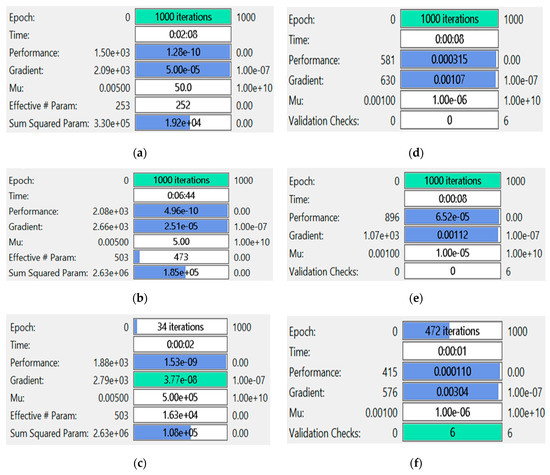 Figure 10a–c provides the results of INSN-BR for PDI models 1, 2, and 3, respectively, while the respective results of INSN-LM are given in Figure 10d–f, where the # means number. The INSN-BR attains the performance of 1.2819 × 10−10, 4.9609 × 10−10, and 1.531 × 10−9 in times of 0:02:08, 0:06:44, and 0:00:02 with 1000, 1000, and 34 epochs. The INSN-LM, meanwhile, attains the performance of 3.12 × 10−4, 6.54 × 10−5, and 1.10 × 10−4 in times of 0:00:08, 0:00:08, and 0:00:01 with 1000, 1000, and 472 epochs. The results clearly indicate that the INSN-BR provides more accurate results than the ISNS-LM but at the cost of bit more computation.