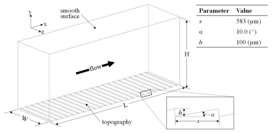 The Reynolds-Averaged Navier–Stokes (RANS) model effectively time averages the equations of motion and introduces turbulence models that are dependent on flow conditions. While the RANS models represent the least computationally expensive approach, investigations of drag-reducing topographies often show weak correlations with experimental data [16,17]. As suggested by its name, the direct numerical simulation (DNS) directly resolves the complete range of spatial and temporal scales of turbulent motion. This requires grid spacings small enough to resolve the smallest turbulent structures—known as the Kolmogorov scales—and small time steps to ensure calculation convergence, therefore requiring significant computing power [18,19]. The large eddy simulation (LES) technique resolves large-scale turbulence while modeling small-scale eddies. Without entering details, it will be briefly reiterated here that as eddy size decreases, the energy contained also decreases. Consequently, the smallest eddies contain the least energy and affect solution accuracy the least, yet they are most computationally difficult to solve. Also, the small-scale eddies are largely isotropic and do not rely on geometry and local flow conditions [20]. LES takes advantage of this by resolving the large-scale eddies and modelling small-scale eddies. This results in a greater solution accuracy than that of the RANS models while obtaining important time reductions with respect to the DNS approach. The LES model has been applied to similar studies on drag-reducing riblets and demonstrates good agreement with experimental data [21,22]. The validation work by Martin et al. with respect to riblets in streamwise flow confirms the applicability of the LES method in modeling of turbulent flows over riblet walls.