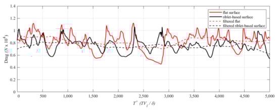 The time-dependent evolution of the drag on flat and structured surfaces for the drag-reducing case, Re = 1750, is plotted in Figure 4. The time-dependent drag for the flat surface was determined as the area integral of the local shear stress. The periodic nature of the ATR surface in the streamwise direction results in flow separation on the secondary facet. Therefore, the time-dependent drag across the ATR surface is the sum of the shear stress acting tangential to the surface along with the pressure drag acting normal to the surface. The pressure drag is a result of the energy required to move a fluid around an object and depends on the frontal area exposed to the flow as well as its overall shape. The streamlined bodies of many aquatic creatures are an example of shapes that reduce pressure drag. By contrast, friction drag is a result of the shear stress of the fluid acting on a surface parallel to flow direction.