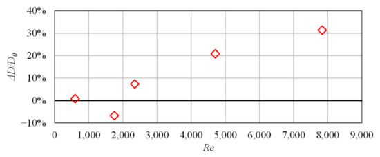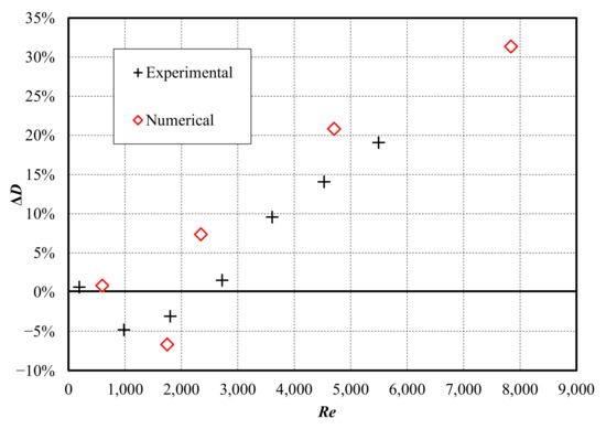 The change in drag achieved numerically and experimentally is presented in Figure 12. When expressed in terms of the Reynolds number, the experimental data show a similar trend to the numerical data. Interestingly, the shape of the drag reduction curve is similar to the one obtained in drag reduction studies involving sharkskin-inspired riblets [10]. Peak drag reduction performance was achieved at a lower Reynolds number in the experiment, indicating that the onset of turbulence occurred more quickly than in the numerical simulation. Several factors have probably contributed to this, including surface roughness of the machined channel walls and structured surface and turbulence introduced by the rotating vanes of the pump and pipe network leading into the channel inlet. As drag reduction begins to break down (beyond approximately Re = 2000), the experimental results demonstrate a similar slope of increasing change in drag with increasing velocity (Re).