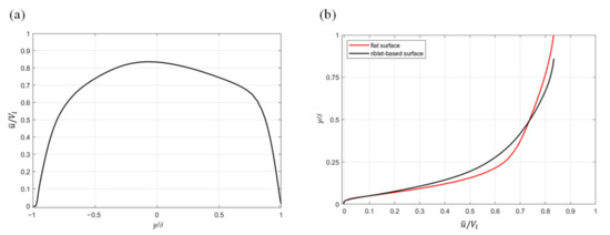 The mean streamwise velocity profile for the drag-reducing case, normalized by Vl, is plotted in Figure 6a. The transverse riblet-based and flat surfaces are located at y/δ of −1 and +1, respectively. From a qualitative standpoint, the velocity profile in the vicinity of the flat surface (0 < y/δ < 1) closely resembles the prototypical turbulent contour, while the velocity profile adjacent to the ATR surface (−1 < y/δ < 0) closely resembles the flat, parabolic curve associated with a laminar flow. The difference between the two velocity profiles is consistent with observations of the ability of natural fish scales to delay the onset of the turbulence. Furthermore, the asymmetry of the velocity plot results in a peak velocity shift toward the riblet-based surface. Since a turbulent boundary layer is thicker than its laminar counterpart, the peak velocity shift also suggests an increase in the turbulence near the flat surface compared to the structured surface. In Figure 6b, the origin of the flat surface profile () has been assumed to be the riblet peak.