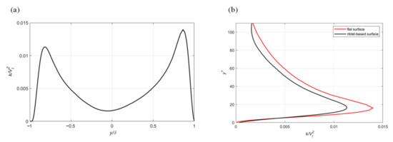 Profile of the normalized turbulent kinetic energy: (a) across the entire channel height and (b) flat vs. structured surface comparison.