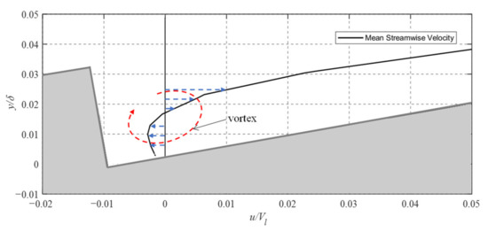 In a recent study of rectangular grooves in transverse flow, the achieved drag reduction was attributed to vortex trapping in the groove valleys [17]. Similar to a moving surface, the counter rotation of the trapped vortices allows the water layer above to slip by more easily than across the stationary facets of each riblet. For the flow conditions and geometry considered here, the center of the trapped vortex is located at approximately 47 µm downstream of the riblet valley and 17 µm above it. Along these lines, Figure 8 depicts a plot of mean streamwise velocity indicating the location of the mean vortex. The vortex is implied by the changing direction of the velocity (the center of the vortex being the location of zero velocity).
