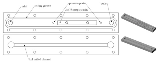 To experimentally validate the numerical results obtained, a closed microchannel was designed and built (Figure 9). This channel enables the measurement of the drop in water pressure caused by the structured sample. Similar setups were used in the past to demonstrate the drag reduction potential of various replicas of naturally structured surfaces [31]. The channel used in this study had a 6 mm width, 1 mm height, and accepts 75 mm long samples to be tested for drag-reduction capabilities. The machined channel was visually examined for defects with an optical microscope and dimensions were measured with calipers. Measured dimensions were used in the relevant calculations. The samples were positioned in such a way to be directly exposed to the flow by essentially forming one of the walls of the channel (typically the upper one). The overall length of the channel was set to be 220 mm to enable a sufficiently long entrance length for flow development purposes. The two halves of the channel were sandwiched together and sealed with a rubber o-ring, forming a closed rectangular channel.