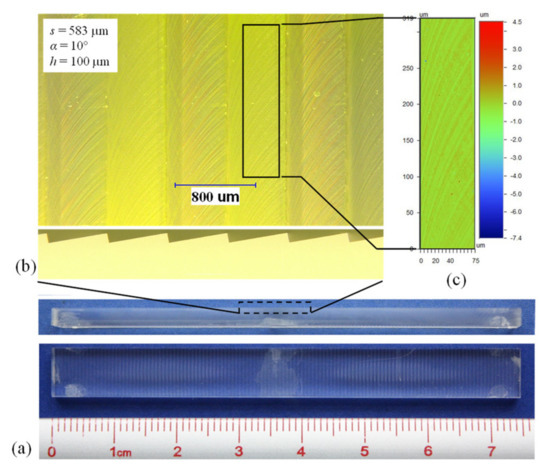 The form accuracy and surface roughness of the fabricated samples were analyzed with an optical microscope and a white light 3D optical profilometer. The well-defined 90° corners of the riblet peaks and valleys illustrated in the side view of Figure 10b demonstrate the high degree of form accuracy achieved. The mean surface roughness (Sa) was approximately 100 nm. While this is an order of magnitude higher than what is considered optical surface quality, it is deemed to be sufficient for the experimental needs of the current study.