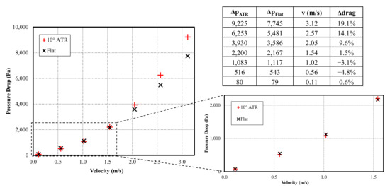 Figure 11 outlines the results of the pressure drop experiments for velocities up to 3.12 m/s (equivalent to Re = 5500). The propagation of error due to the repeatability of the rotameter and the statistical uncertainty of the pressure measurements (2σ) was calculated for each flow rate. This results in a calculated maximum error of +/− 4.5% of the measured pressure. The reduction of drag was reported for these experiments as a percentage change in the pressure drop with the ATR/riblet-based sample relative to the flat surface. The values reported in the table represent the real change in drag, i.e., a value that accounts for the area fraction. At high flow velocity, it is evident that the ATR-structured functional surface has a higher pressure drop than its flat counterpart. There is, however, a small region at low velocities where drag reduction was present. The peak drag reduction of 4.8% corresponds to a channel velocity of 0.56 m/s and a Reynolds number of 1000. The peak numerical drag reduction of 6.7% was achieved at a similar 0.58 m/s; however, the difference in characteristic dimension of the channel means the optimal performance was achieved at Re = 1800.