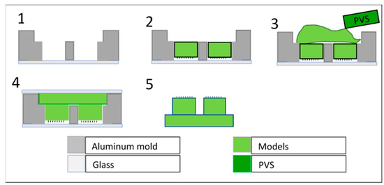 To prepare samples to fit the customized adhesion test-rig used in this study, the adopted concept placed six small cylinders (∅ 2 mm and 1 mm in height) on the same sample, while all cylinders faces, whether they had either mushroom-shaped or smooth flat faces, were aligned on the same plane. To complete this step, the process reported in reference [17] was used. A specific aluminum template was manufactured via a CNC process. The mold contained a socket with six round holes in the bottom, which were arranged symmetrically to achieve, as far as possible, an equal load distribution, which is a necessary condition in tribological characterization. The process consisted of placing the aluminum mold onto a glass panel, before inserting the six cylindrical models into the holes of the biomimetic microstructures, meaning that the tested side was in contact with the glass to enable flattening, thus verifying that the cylinders were aligned in the same plane. Next, a PVS fixative elastomer was placed on top of the aluminum mold to unite the six different cylinders into one model. A second flat glass was used to flatten the PVS to achieve a uniform thickness of the final model. Finally, after polymerization, the resulting model was released from the aluminum mold (Figure 1).