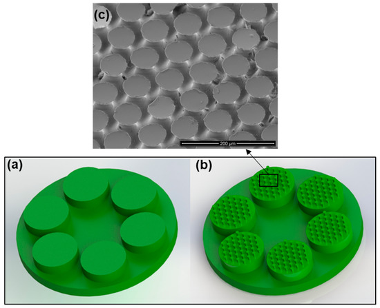 Following the preparation process described above, two different samples were prepared and tested: a flat reference sample in which all six sub-contract points were cylinders with flat smooth surfaces (see Figure 2a), and a mushroom-shaped microstructure sample in which all six sub-contract points were cylinders with mushroom-shaped microstructures (see Figure 2b). It is important to note that all cylinders (micro-mushroom-shaped and flat) were randomly placed inside of the aluminum mold due to their isotropic property.