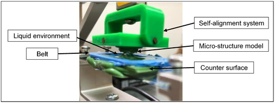 The samples, i.e., flat sample (FS) or mushroom-shaped microstructure sample (MSMS), were mounted on the holder and connected to the self-alignment system. Next, the selected counter-face specimen, which was already glued to a microscope slide glass, was mounted on the moving holder attached to the translating stage. The fixation screws were then reinforced to prevent any unwanted movement (see Figure 4).