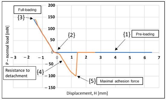 Figure 6 presents the typical behavior of an adhesive contact, which occurs when the normal load is displayed as a function of the vertical displacement Hmm (distance between the model and the substrate “counterface”). This behavior can be divided into five characteristic stages: In stage (1), models approach the opposite models before making contact with each other, and in stage (2), the models (smooth control reference model or mushroom-shaped microstructure model) come into contact with the counter-face. In step (3), the system is loaded until it reaches the desired value of the normal pre-load, and in step (4), the resistance to detachment is measured as a function of displacement in the opposite direction at a pre-determined separation speed. When there is no adhesion, disconnection occurs almost immediately. However, when the contact is adhesive, disconnection does not occur immediately. The force continues to decline in the negative stage due to resistance to disconnection. Full disconnection occurs at point Pa,max (5), which corresponds to the maximum adhesion force measured for each test. Finally, the system stabilizes after slight fluctuations.