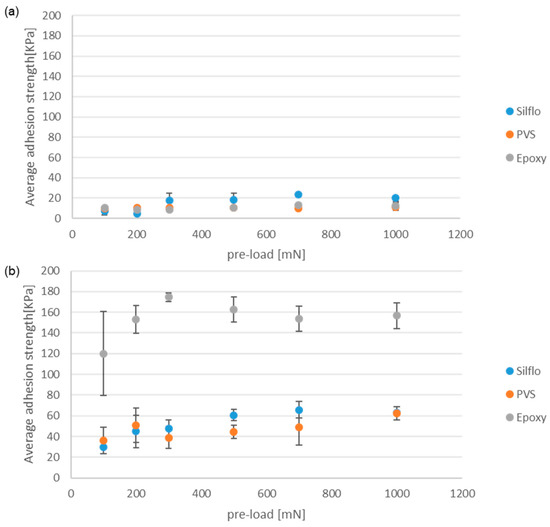 Figure 7 displays the average values of the maximal adhesion strength obtained using the three counter-face materials (epoxy, PVS, and SILFLO©) that have almost the same surface roughness (Ra around 0.1–0.5 µm, replicated from a microscope slide) under dry contact conditions. The maximal adhesion strength is displayed as a function of the applied normal pre-load. Data presented in (a) were obtained via a smooth control reference model, while data presented in (b) were obtained via a mushroom-shaped microstructure model tested under the same operational conditions.