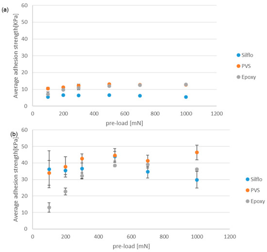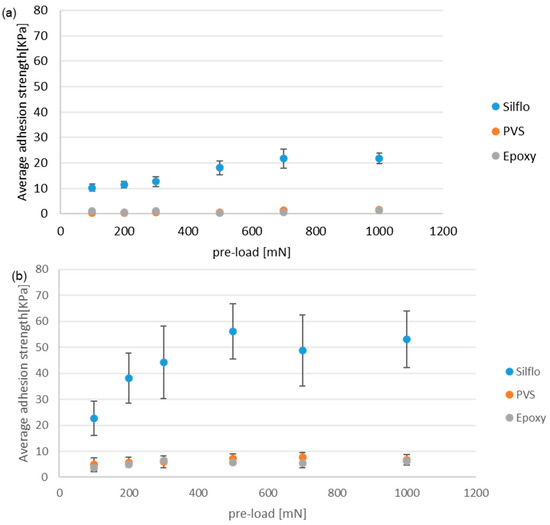 Figure 9 displays the average values of the maximal adhesion strength for (a) smooth reference and (b) mushroom-shaped microstructure samples tested under Glycerol wet condition (contact submerged with glycerol during the adhesion test). The maximum adhesion strength is displayed as a function of the applied normal pre-load for the three counter-face materials (epoxy, PVS, and SILFLO©), which have the same surface roughness.