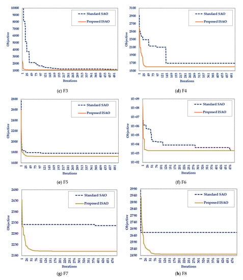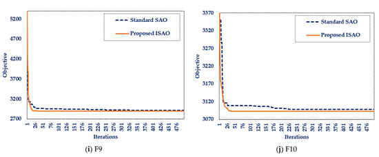 The performance analysis of the designed ISAOA and standard SAOA for ten widely used mathematical problems is shown in Table 2. Additionally, Figure 2 presents the most desirable convergent motion characteristics. This table demonstrates the resilience of the produced ISAOA in determining the optimal solution to the majority of the investigated mathematical problems by explicitly showing that the designed ISAOA runs and works better than the standard SAOA in the tested mathematical functions. According to the best-obtained objective, the suggested ISAOA outperforms the standard SAOA for all investigated benchmarks except F6, with a success rate of 90%. In addition, the suggested ISAOA surpasses the regular SAOA for all examined benchmarks, with the exception of F6 and F10, according to the mean achieved objective, with a success rate of 80%. Moreover, the adopted ISAOA surpasses the regular SAOA for all benchmarks examined, with the exception of F6, F8, and F10, with a success rate of 70%, according to the worst attained objective. According to this table, the proposed ISAOA beats the conventional SAOA for the best, mean, worst, and standard deviations in 70% of the benchmark functions’ statistical indices regarding the benchmarks investigated. The success rates attested demonstrate the considerable efficacy of the proposed ISAOA combining the advised cooperative learning technique.
