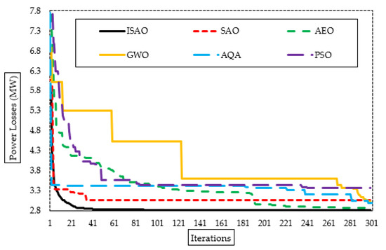 The suggested ISAOA, standard SAOA, AEO, AQA, PSO, and GWO converging properties are also shown in Figure 5. As shown, the proposed ISAOA has a high and quick capability to find promising areas. After only fifty iterations, it starts, with precedence compared to the others, searching to minimize the losses of less than 2.83 MW. Despite the AQA converging at an earlier iteration, it becomes stuck in a local optimizing area for more than 150 iterations.