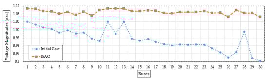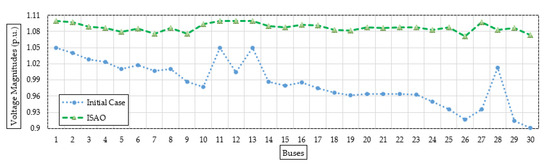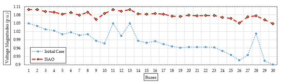 Figure 6 shows the bus voltage after installing the candidate TCSC device based on the suggested ISAOA vs. the initial instance to demonstrate a range of voltage enhancements. As can be seen, grid buses have made significant advancements. The last grid bus (No. 30) has the biggest voltage profile rise, increasing from 0.9012 per unit (p.u.) to 1.0696 p.u. with an improvement percentage of 15.74%.