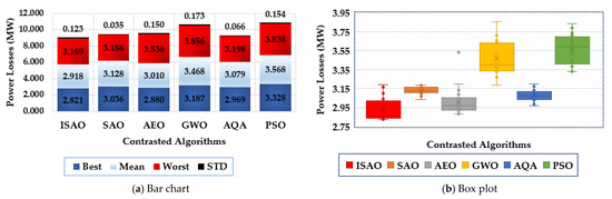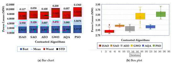 Figure 10 shows the features of the proposed ISAOA, conventional SAOA, AEO, AQA, PSO, and GWO across the individual runs to evaluate their statistical assessment. It has been demonstrated that the suggested ISAOA outperforms the competition. According to the best losses, the proposed ISAOA acquires 2.82 MW losses with an improvement of 9.08%, 1.62%, 12.60%, 16.1%, and 5.85%, respectively compared to the standards SAOA, AEO, AQA, PSO, and GWO. In addition, the suggested ISAOA, when compared to the normal SAOA, AEO, AQA, PSO, and GWO, acquires 2.938 MW losses with improvements of 6.39%, 1.66%, 16.08%, 18.8%, and 5.37%, respectively, in line with the mean losses. The designed ISAOA acquires 3.168 MW losses in accordance with the worst losses, with improvements of 0.41%, 1.43%, 24.21%, 21.3%, and 0.40%, respectively, compared to the standard SAOA, AEO, AQA, PSO, and GWO.