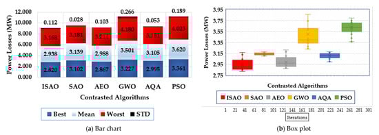 To assess the statistical evaluation of the compared techniques, Figure 7 displays the characteristics of the suggested ISAOA, standard SAOA, AEO, AQA, PSO, and GWO in terms of the best, mean, worst and standard deviation (STD) over the separate runs. As shown, the proposed ISAOA derives the best performance by acquiring the smallest measurements of the best and mean power losses of 2.8217 and 2.93 MW, respectively.