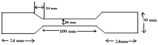 Tensile properties of insole materials were studied in compliance with the SATRA TM 2 test method (Tensile properties of insole materials). A rectangular test specimen was gradually stretched using a tensile testing machine (ELW(EX) Auto-tensile tester, Labthink Instruments Co., Jinan, China). Three test specimens with the dimensions shown in Figure 1 were cut from the foam sheet with a thickness of 6 ± 1 mm in the direction perpendicular to foam rise. The tensile testing machine was adjusted so that the jaws were 100 ± 1 mm apart. Both ends of the test specimen were inserted in the corresponding jaws of the tensile testing machine and clamped. The tensile testing machine was operated at an elongation rate of 100 ± 10 mm/min. All test specimens were tested until failure. The following test parameters were recorded for each test specimen: extension at maximum load (%), tensile strength at maximum load (MPa) and Modulus of elasticity (MPa).