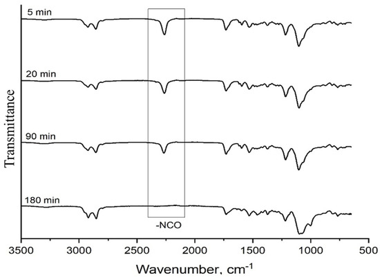 In this study, the FTIR-ATR was used to determine isocyanate conversion during polyurethane formation. The isocyanate absorption band is assigned at approximately 2270 cm−1 and the decay in intensity of this absorbance was used to monitor the isocyanate group conversion during the polymerization and is presented in Figure 2.