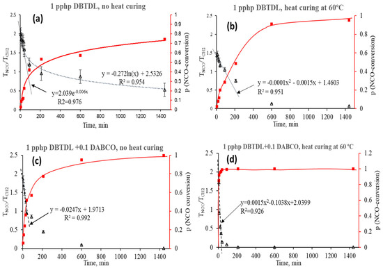 The kinetics of the CO/PO3G/TDI synthesis reaction is presented in Figure 3a–d. Panels a–d correspond to the different combinations of catalysts and heating regimes applied. The dotted curve in each panel demonstrates the relative change in –NCO band transmittance with respect to the methylene group signal and the solid curve indicates isocyanate conversion, p. The dotted curve/part of the curve was constructed based on an average decrease in the TNCO/TCH2 transmittance ratio from three replicates of the experiment. The conversion, p, was plotted according to Equation (7):