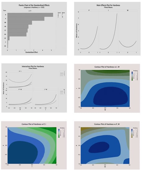 Response surface for the hardness of PUF as a response variable demonstrated curvature and it is for this reason that Box—Cox transformation was employed to increase the sensitivity of the model. The Pareto chart (see Figure 4) and Table 4 demonstrate significant and non-significant terms in the proposed model. After statistical analysis, the regression equation in uncoded units (only statistically significant terms included), which demonstrates the contribution of factors to the hardness property of the material, is presented below: