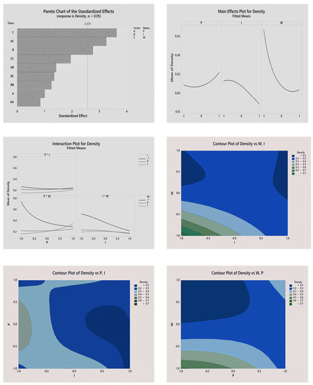 Initial evaluation of significant and non-significant terms was performed by analyzing the Pareto chart presented in Figure 5 and Table 5. As can be seen, Factor W had the highest value of standardized effect and the steepest slope on the main effect plot (Figure 5), hence the largest impact on the density of the PUF. Thus, the higher the level of blowing agent and II in the material, the lower the density of PUF.