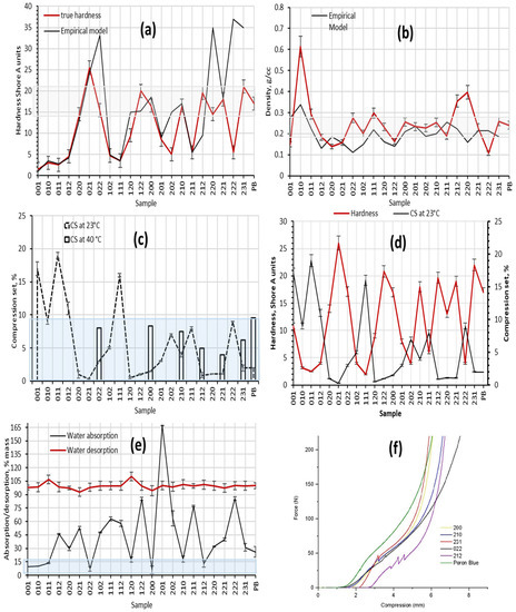 Results of mechanical and physical testing of PUF samples and PB-reference commercial material. (a) Hardness; (b) density; (c) Compression at different temperatures; (d) Hardness and CS; (e) Water absorption; (f) Compression curves.
