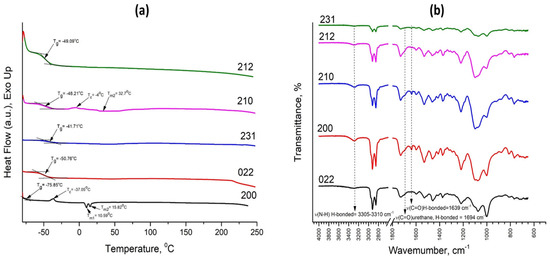 Furthermore, the DSC thermogram demonstrates that samples 212, 210 and 231 are stable up to 250 °C, while samples 200 and 022 start to decompose at temperatures beyond 215 °C, which can be concluded from the presence of the endothermal shift in the DSC curve. Conclusions made based on DSC analysis are well aligned with the results of FTIR analysis of the PUFs (Figure 7B). The samples with higher degrees of phase separation have more pronounced adsorption bands corresponding to the H-bonded N-H group at 3305–3310 cm−1, hydrogen-bonded carbonyl groups of urea linkage at 1639 cm−1, and urethane linkage at 1694 cm−1.