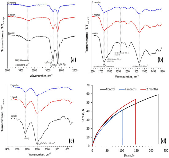 Spectral changes in N-H, C-H absorption region (a), C=O absorption (b), C-O-C (c) absorption regions of bio-degraded PUF foams and changes in mechanical properties of treated foam samples and control PUF. Sample 200 (d).